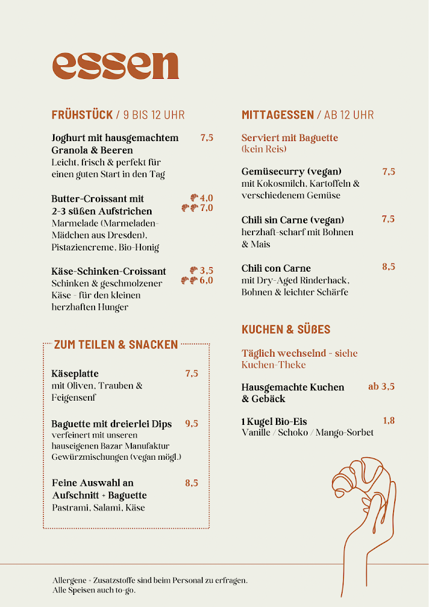 Welcome to Arnold's Café & Genuss-Oase | Rösterei Arabica x Bazar Manufaktur in Leipzig, where culinary delights meet a cozy atmosphere. The menu is designed to cater to diverse tastes, making it perfect for any time of day. Start your morning with yogurt and homemade granola or indulge in a butter croissant spread with an array of sweet toppings, all priced reasonably. For a heartier option, the cheese and ham croissant hits the spot.